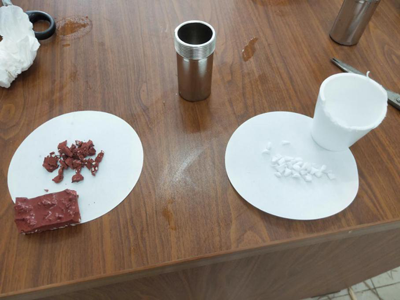 研磨實例:塑膠跑道和塑料杯的研磨,為滿足研磨在常溫下進行,使用液氮預先脆化后再研磨,將塑膠材料剪碎放入鋼罐中,把專用研磨珠加入鋼罐后把鋼管擰緊,然后把鋼罐放置液氮中泡制幾分鐘,把研磨儀相關參數調整完畢,最后把帶樣品鋼罐放入研磨儀里進行研磨。
